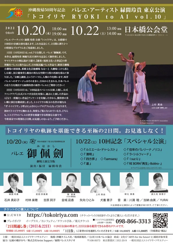 バレエ・アーティスト 緑間 玲貴のバレエ公演『トコイリヤ RYOKI to AI vol.10』は沖縄復帰50周年の記念公演を日本橋公会堂(東京都・中央区)で開催。また10回目の記念公演としてプログラムは日替わりで、新作バレエ「御佩劍」と「10回記念スペシャルプログラム」を上演。チケットは本日8月27日(土)に発売!