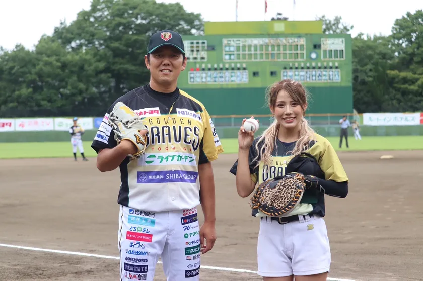 240kmのボールをキャッチし、ギャル系野球女子YouTuber(ユーチューバー)として注目されている「めいちゅん」は、2022年8月25日(木)に栃木県佐野市運動公園野球場で行われた栃木ゴールデンブレーブスにて始球式ならぬ“補球式”を行いました。