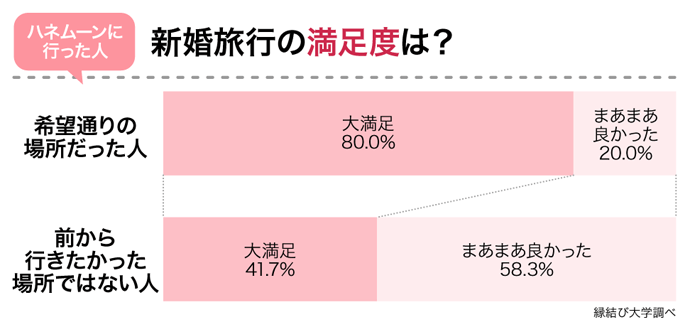 「前から行きたかった所ではない」人の新婚旅行に対する満足度はやや低い