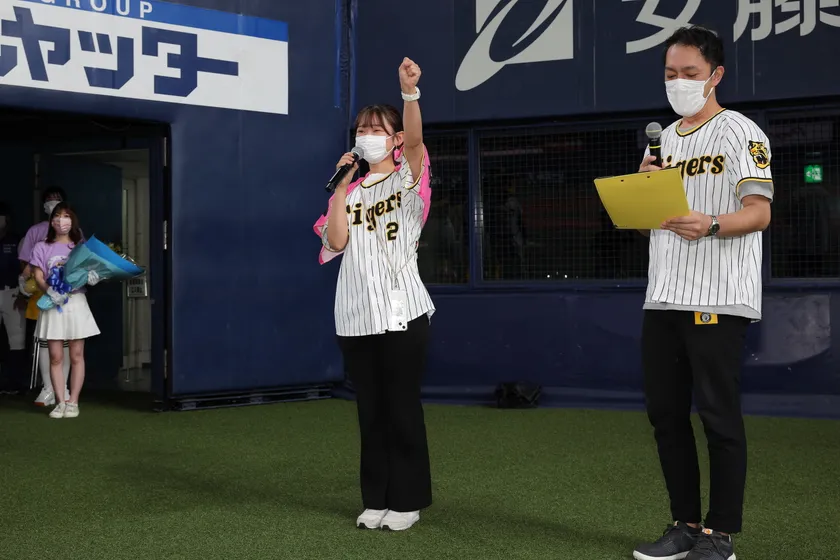 試合前に、川口葵さん、高梨優佳さんによるTORACOダンスのレクチャータイム。タイガース選手が踊る動画もビジョンに登場。