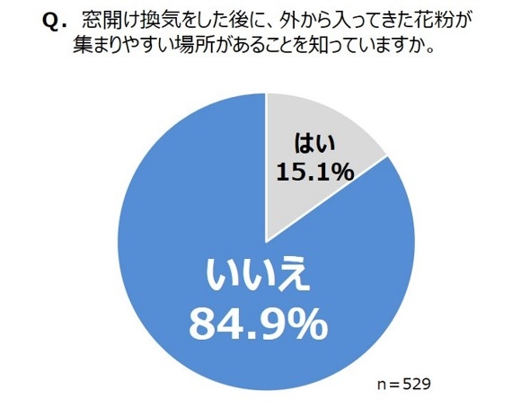 また、「窓開け換気をした後に、外から入ってきた花粉が集まりやすい場所があることを知っていますか。」という質問に対して、84.9%の人が「いいえ」と回答し、花粉が集まりやすい場所の存在を知らないことが判明しました。