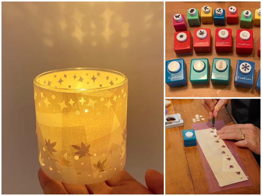 吉野ヒノキと吉野手漉き和紙を合わせたシートに、お好みの模様を型抜きして作成、柔らかなあかりがこぼれ、模様が優しく揺らぎます。