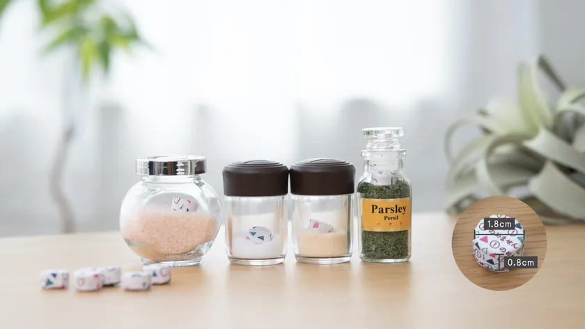 調味料を保存している容器に入れておくだけで最長1ヶ月間、塩、中華調味料をはじめ様々な調味料を湿気から守ります。