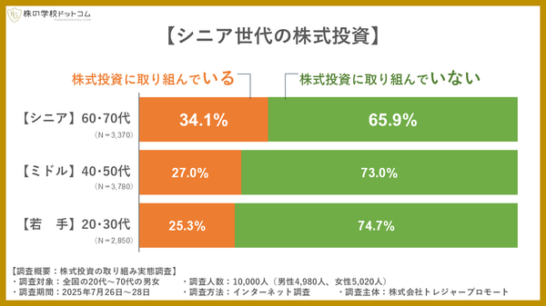 株の学校ドットコムが全国1万人を対象に行った大規模調査の結果によると、まず、シニア世代で株式投資に取り組んでいる人の割合は34.1%でした。40代・50代のミドル世代が27.0%、20代・30代の若手世代が25.3%だったのと比べて、唯一3割を超えており、最も株式投資が浸透している世代と言えます。