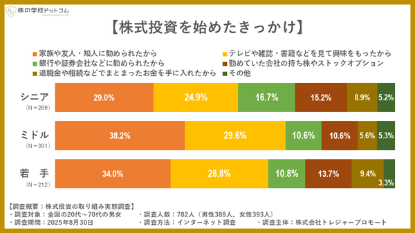 ただ、シニア世代の特徴として、他の世代と比べると「家族や友人・知人」「テレビや雑誌・書籍」の割合がやや少なく、その代わりに「銀行や証券会社などに勧められたから」「勤めていた会社の持ち株やストックオプション」の割合が高くなっていることがわかります。