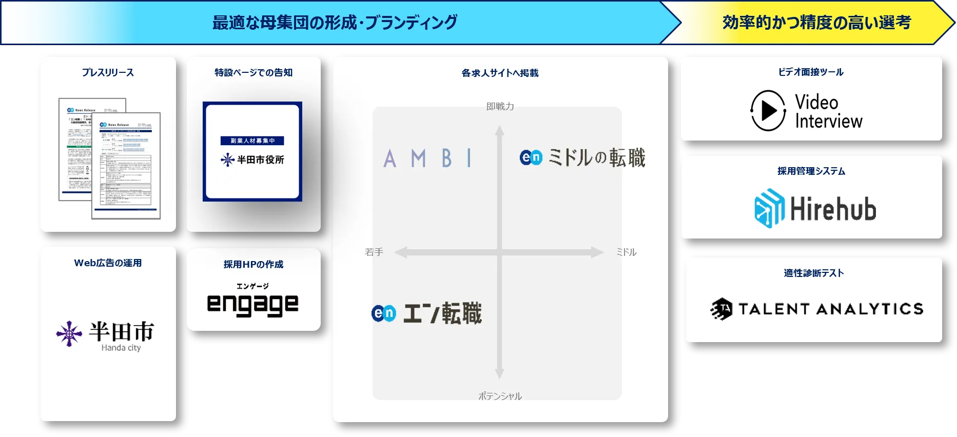 プレスリリースや特設ページ、採用HPの作成、Web広告での告知に加え、各求人サイトでの集客支援を行ないます。『エン転職』『AMBI』『ミドルの転職』とターゲットの異なる3つの求人サイトを活用することで、ターゲットへ網羅的に求人を届けます。ビデオ面接ツール『VideoInterview』、採用管理システム『Hirehub』、適性診断テスト『Talent Analytics』の提供により、選考フローを支援。求職者と同社の適切なマッチングを実施します。