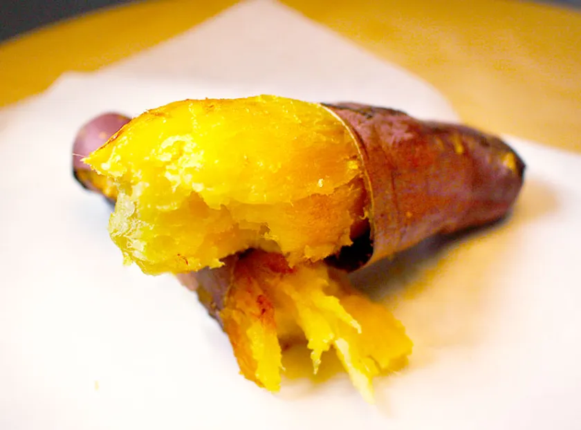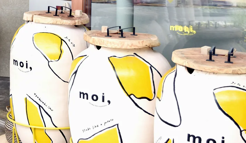 店名の「moi,」は「イモ」を逆に読んだことば遊びと、フィンランド語の「やあ!」というあいさつの言葉が由来になっています。石焼き芋のように芋を直火で焼くのではなく、壺の中で1時間半から2時間ほどじっくりと蒸し焼きにするため、遠赤外線効果によって甘みが増し、濃厚な焼き芋が出来上がります。