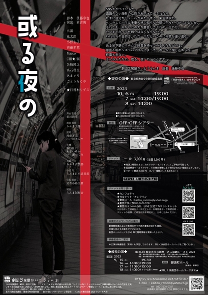 劇団芝居屋かいとうらんま主催、『或る夜の』が2023年10月6日(金)~10月8日(日)にOFFOFFシアター(東京都世田谷区北沢2-11-8TAROビル3F)にて上演されます。チケットはカンフェティ(運営:ロングランプランニング株式会社、東京都新宿区、代表取締役:榑松 大剛)にて発売開始です。