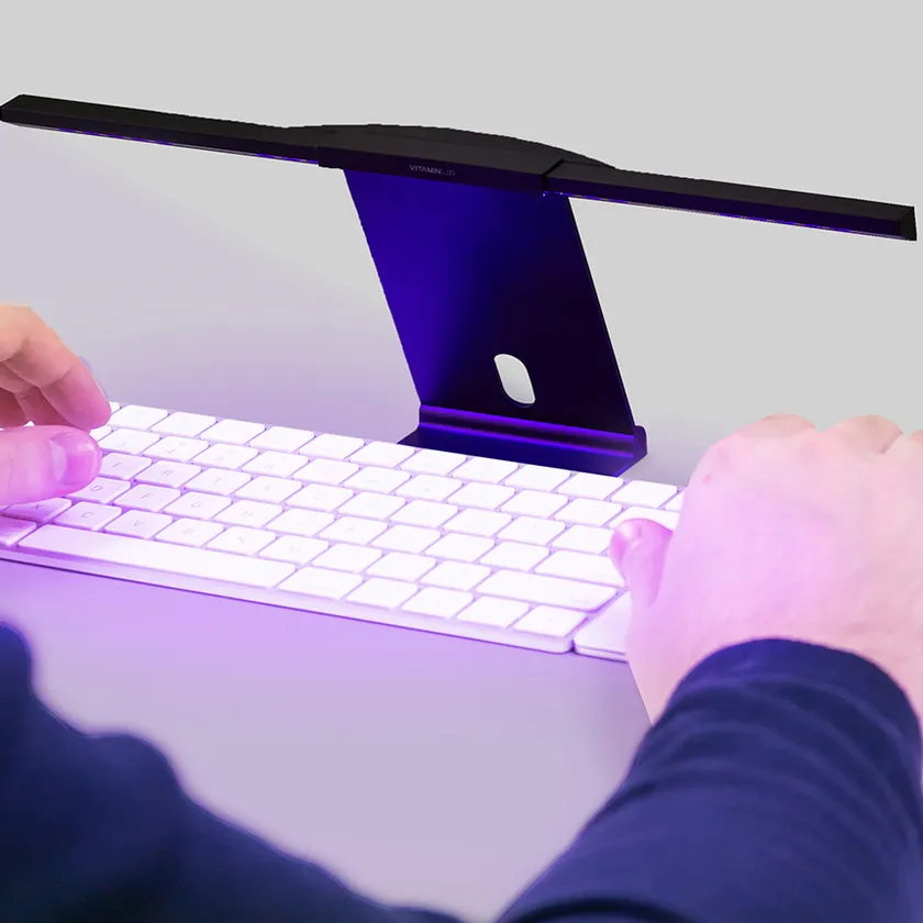 目に見える光波長で常時使用が可能な除菌器として、デスクワーク時に除菌器を付けたままパソコン作業やキーボードを打ち込むことができる画期的な除菌スタンドです。