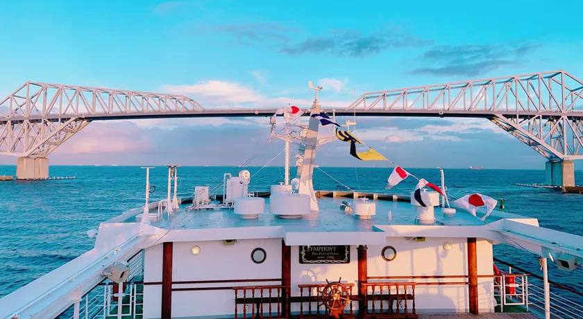 日の出埠頭を出航したSYMPHONYはレインボーブリッジをくぐりぬけ、二つ目の橋、東京ゲートブリッジを通過後、羽田沖から神奈川県に入り、鶴見つばさ橋、横浜ベイブリッジ、横須賀沖に浮かぶ無人島「猿島」を望み、大きく千葉方面へ旋回します。東京湾アクアライン付近では海上に浮かぶ「海ほたる」に接近し、舞浜沖からは東京ゲートブリッジ・スカイツリー・お台場・東京タワーなどの景色を正面にとらえながら帰港する、6時間に及ぶ見応えたっぷりの大航海です。