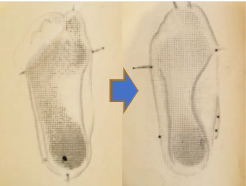 下図フットプリントのお客さまは、「少し歩くだけで足が疲れるから、歩くことが大嫌いだった」という典型的な扁平足のお足でした。その後、くつトレ(R)を実践し、わずか3ヶ月で劇的なビフォーアフターを遂げ、「今では歩くことが楽しい!」とウォーキングが日課となっています。