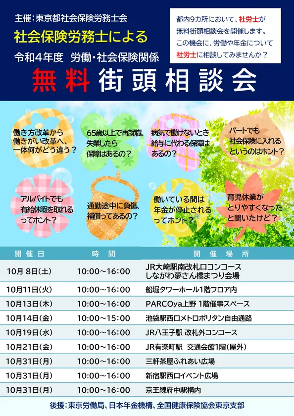 東京都社会保険労務士会(会長 寺田 晃)は、「社労士制度推進月間」である10月に社会貢献事業の一環として、都内9か所において社労士による無料街頭相談会を以下のとおり開催します。職場のお悩みや年金に関する疑問などに労働・社会保険諸法令と労務管理の国家資格者である社労士が無料で相談に応じます。この機会に是非、ご利用ください。