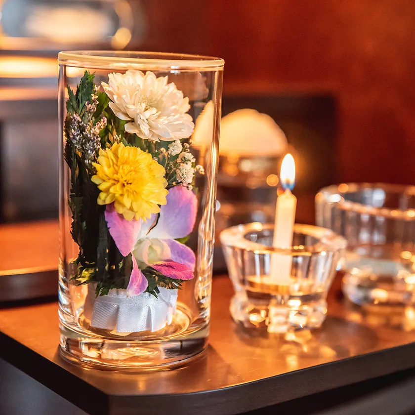 グラスフラワーは、お花の色合いをそのままに、長期間楽しめるよう特殊な加工を施したドライフラワーを、透明度の高いガラスの器にアレンジしたフラワーギフト商品です。