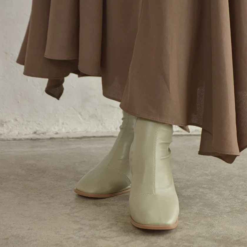 グリーンのブーツといえば少し履くのがそわそわしそうですが、彩度を落としグレーが混じった優しいピスタチオグリーンに仕上げました。