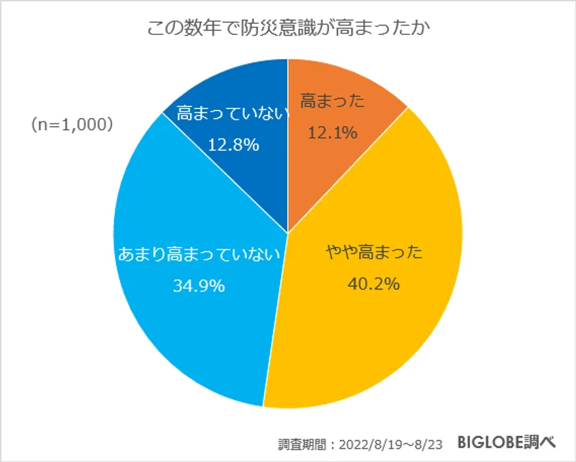 また「この数年で防災意識が高まったか」という質問をしたところ、半数以上の52.3%が「防災意識が高まった/やや高まった」と回答した。