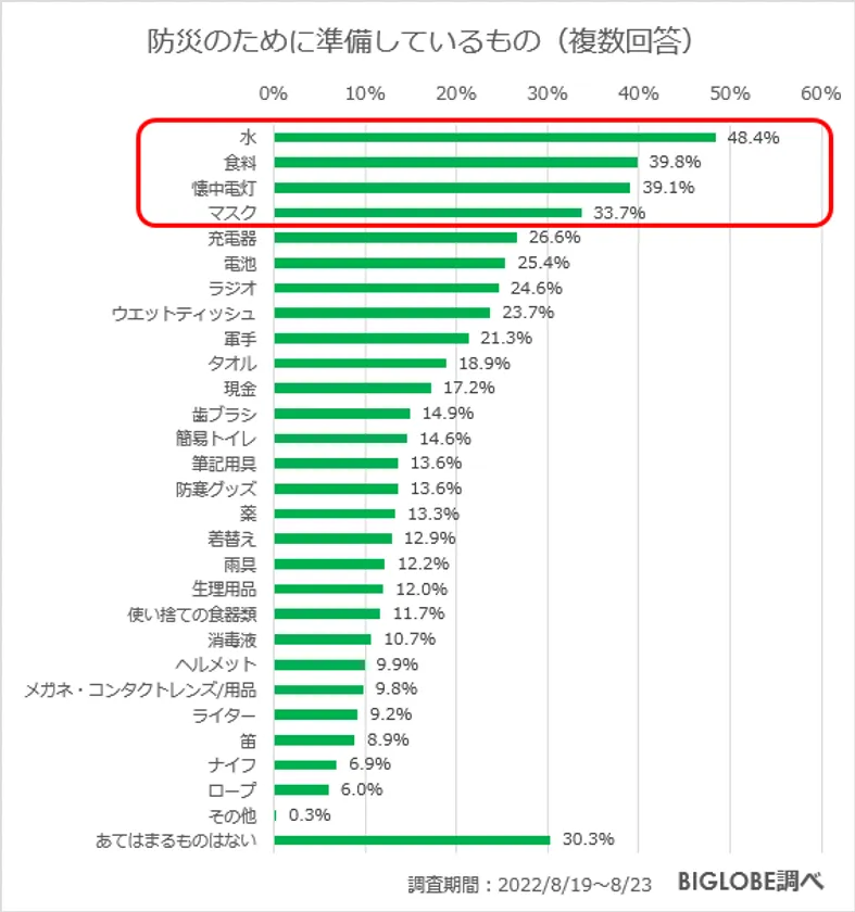 全国の18歳から59歳までの男女1,000人に、「防災のために準備しているもの(複数回答)」を質問したところ、「水」(48.4%)、「食料」(39.8%)、「懐中電灯」(39.1%)、次いで「マスク」(33.7%)となった。