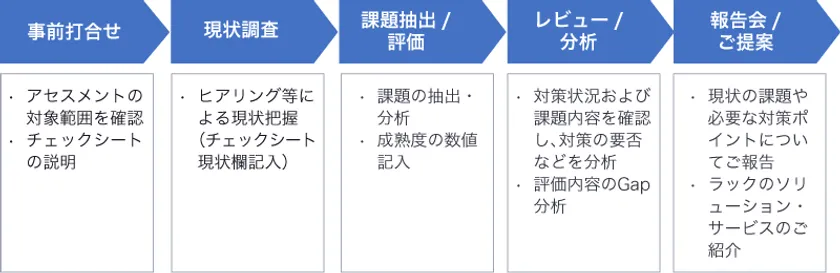 CIS Controlsに記載されている対策項目により、具体的な対策例を追加したラックオリジナルのチェックシートを提供します。さらに、対策状況のヒアリングから課題を抽出、分析結果を含むアセスメント実施報告書の作成までを、ラックのセキュリティコンサルタントが支援します。また、アセスメント結果から抽出された評価の低かった対策項目に対しては、ラックが提供するセキュリティソリューションやサービスの提案も行います。このサービスによって机上だけの評価ではなく、より現実的で組織規模や実態に合わせた最適なセキュリティ対策を実現できます。