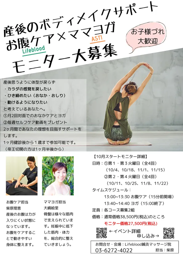 株式会社Lifeblood(所在地:東京都千代田区富士見2-2-12 伊藤ビル3F、代表取締役:谷本 卓也)は、当社が運営するLifeblood鍼灸マッサージ院(ライフブラッド)にて鍼灸マッサージ師で女性の身体の不調や産後ケアに従事するスタッフと、女性が生き生きと過ごすためのコンディショニングを提供するヨガインストラクターが、出産後の女性を対象とした出産後の体型を戻すことができる新サービス「産後のボディメイクサポート~お腹ケア×ママヨガ~」の提供を2022年10月より開始します。