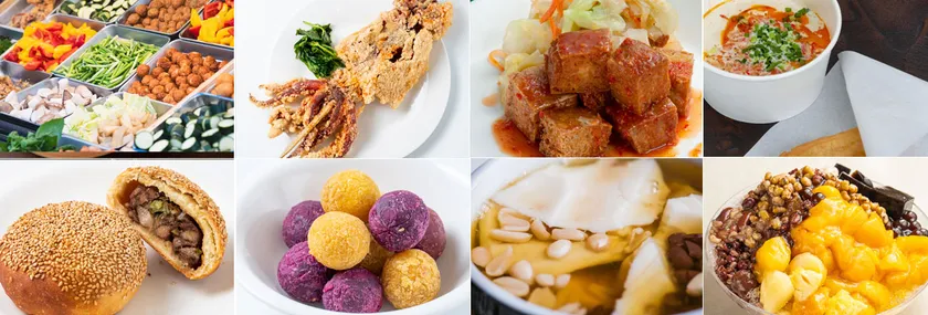 「塩酥鶏(イエンスージー)」、「酥炸大魚尤(※)魚(いかの姿唐揚げ)」、「炸臭豆腐(ザーチョウドウフ)」、「鹹豆漿(シェンドウジャン)」、「胡椒餅(フージャオビン)」、「地瓜球(ディーグァーチョウ)」、「豆花(トウファ)」、……その他多数!