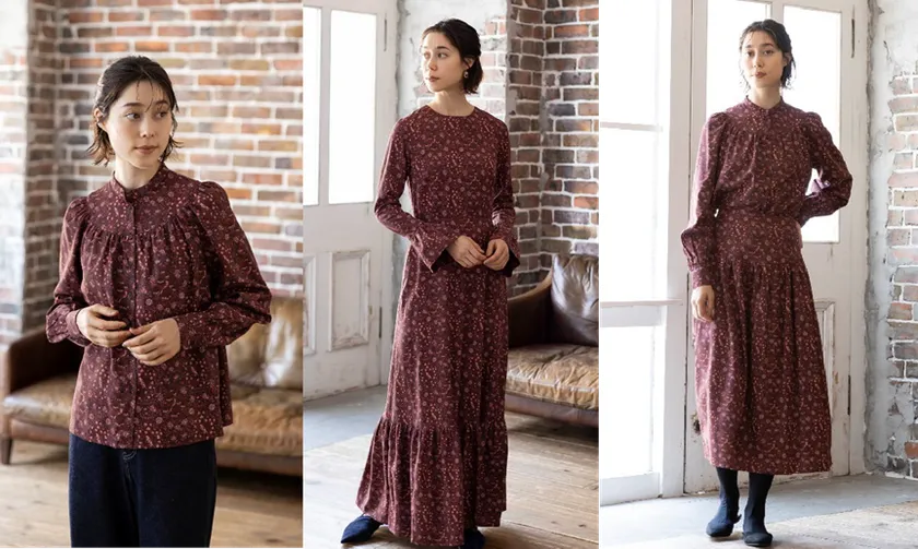 幅広く合わせやすい洗練されたモノクロームの華やかな花柄で、秋冬らしいクラシカルなトップス、ワンピース、キルティングベスト、スカートの4型をつくりました。