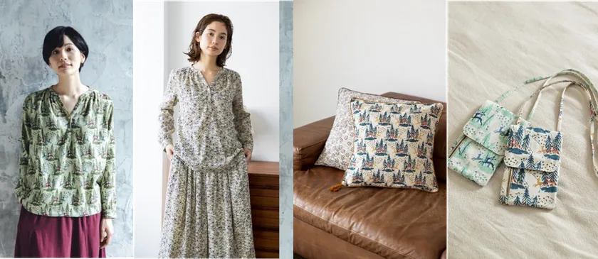 しなやかなテンセル生地に花々や小鳥のモチーフを散りばめた秋らしい色合いのプリントで、トップス、ワンピース、スカートの3型をご用意しました。