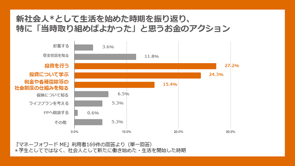 新社会人として生活を始めた時期を振り返り「(当時は行っていなかったが)取り組めばよかった」と感じるお金のアクションとして「投資を行う(27.2%)」「投資について学ぶ(24.3%)」「税金や各種控除等の社会制度の仕組みを知る(15.4%)」が上位に挙がりました。