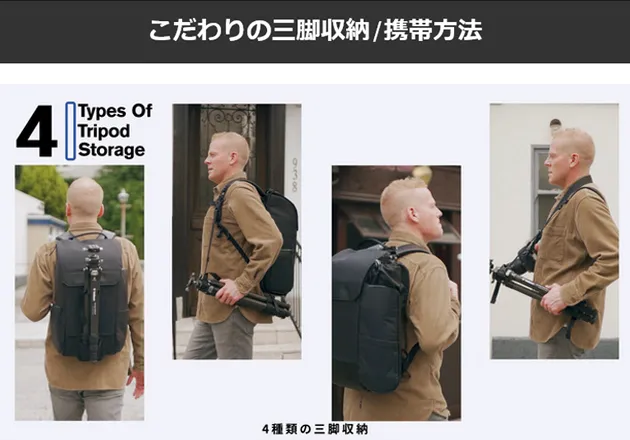老舗三脚メーカーが考える、三脚収納/携帯にこだわったバッグ。4タイプの収納/携帯方法を実現。お手持ちの三脚サイズや他の収納物とのバランスを考え、収納・携帯方法をチョイスできます。