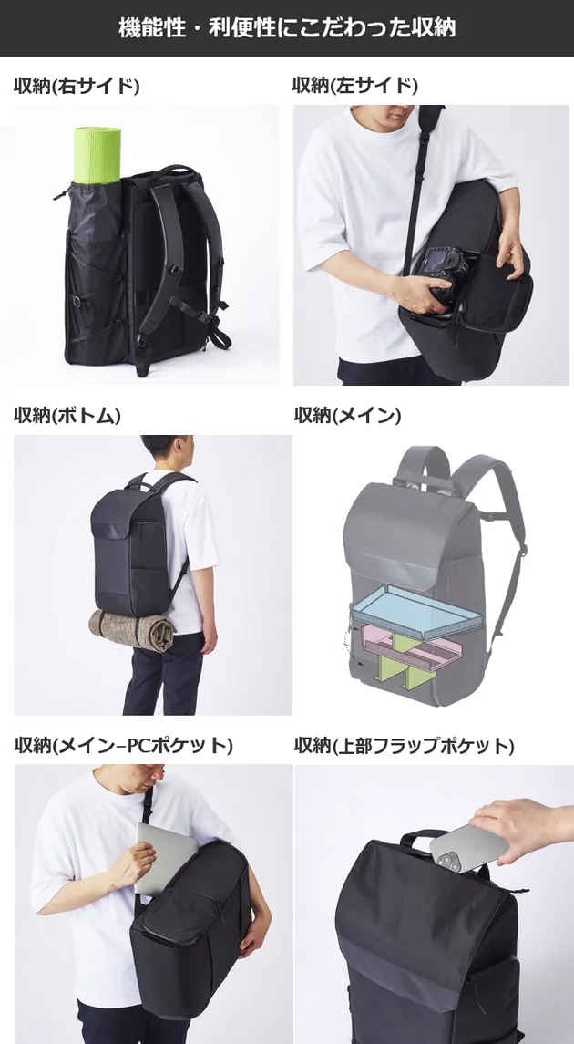 三脚やヨガマット、折りたたみ傘や飲み物(2Lペットボトル収納可)、靴など用途に合わせて収できます。開口上部にフードがついているので、収納物の大きさに合わせて簡単に長さ調整ができます。収納部は独立しているので、メイン収納部と分けて収納ができます。