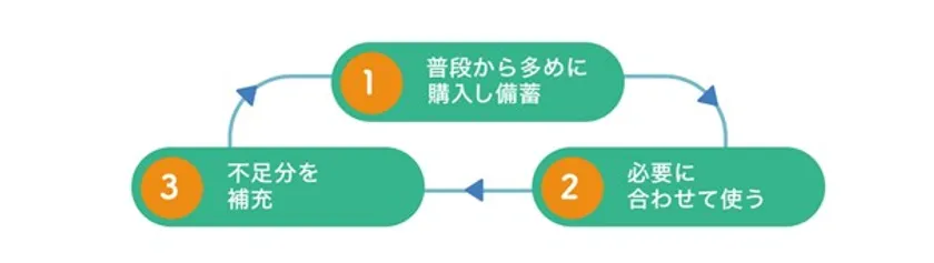(1)>(2)>(3)と続く「ローリングストック」を習慣にし、災害時でも使い慣れたものを使える環境を作りましょう。また、備蓄品それぞれの賞味期限や使用期限が切れていることのないよう、普段から食べたり使ったりして確認しましょう。