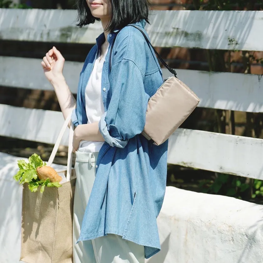 ショルダーストラップを含めて、総重量95g!コンビニおにぎりが110gくらいありますのでそれよりも軽く、バッグの存在を忘れてしまうほどの軽さです。ポケット感覚でスマホや貴重品を入れて軽やかに動き回りたい人に使ってほしいバッグです。