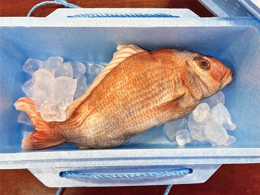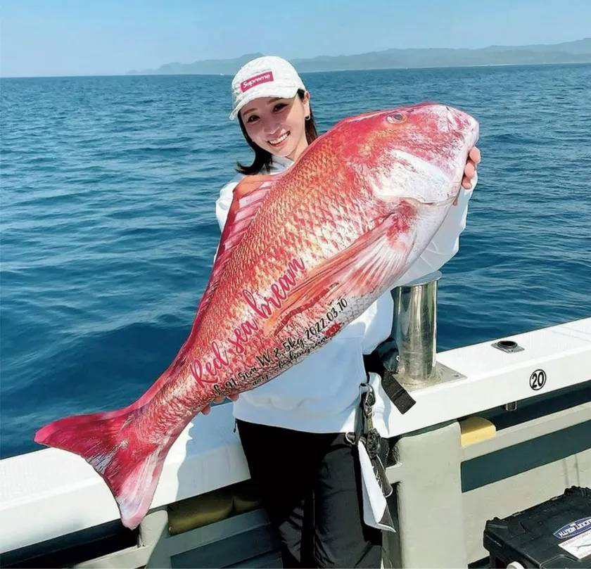 真鯛(92cm)のぎょたクッションと釣り女子