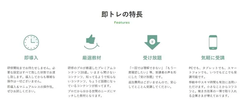 『即トレ』は、【即導入】・【厳選教材】・【受け放題】が合言葉のWEB研修サービスです。