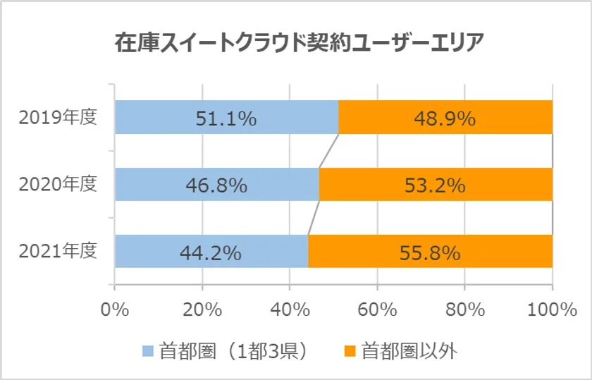 実際に、単一拠点(横浜市)の当社は主力サービスであるクラウド/SaaS在庫管理システム「在庫スイートクラウド」の契約企業において、コロナ禍でオンライン会議が急速に普及した2019年度以降、近隣エリア(首都圏1都3県)以外の契約件数が増加しています。