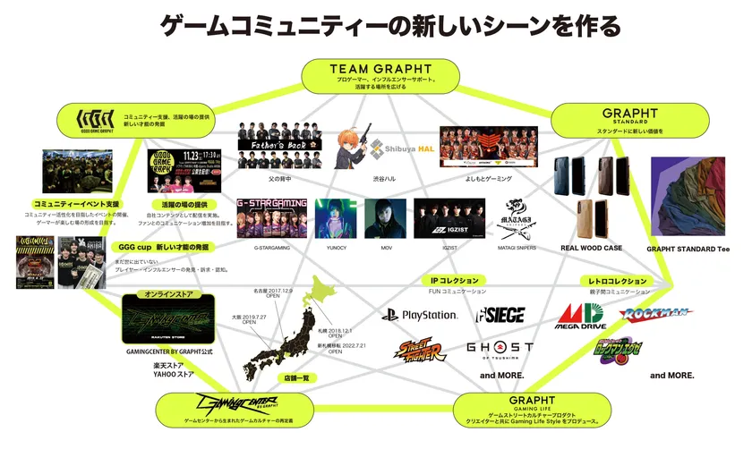 2003年ゲーミングファーニチャーを世界でいち早く手がけ、eスポーツ関連事業を展開。これまでも多くのゲーミングカルチャーに関連したグッズやアパレルの販売を行い、ゲームプレイヤーやインフルエンサーをサポート、ゲーミングセンターの運営やイベントの企画運営、様々なゲームタイトルやプレイヤーとのコラボレーションなども積極的に手がけています。また、ゲーミングデバイス市場トップレベルのRazerの日本での正規代理店でもあり、自社ブランドGRAPHTのほか、各地の地場産業との協業をベースとしたプロダクトデザインを手がけ「COLORS」、「EQUAL PROJECT」といったブランドを国内外に広く展開しています。