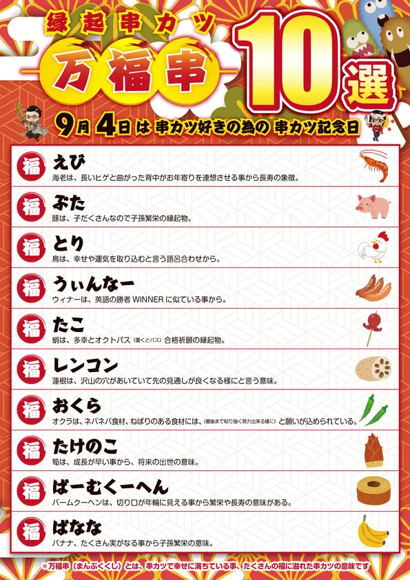 一般社団法人日本串カツ協会が、9月4日「串カツ記念日」の 目玉として、縁起の良い串カツ「万福串」を発表