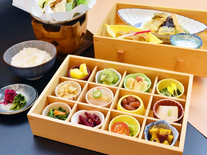 京料理「花ごころ」料理長と管理栄養士の監修による睡眠の質向上に効果があるとされる食材を使った特別メニュー。季節の素材を生かした創作精進料理をたのしむ。