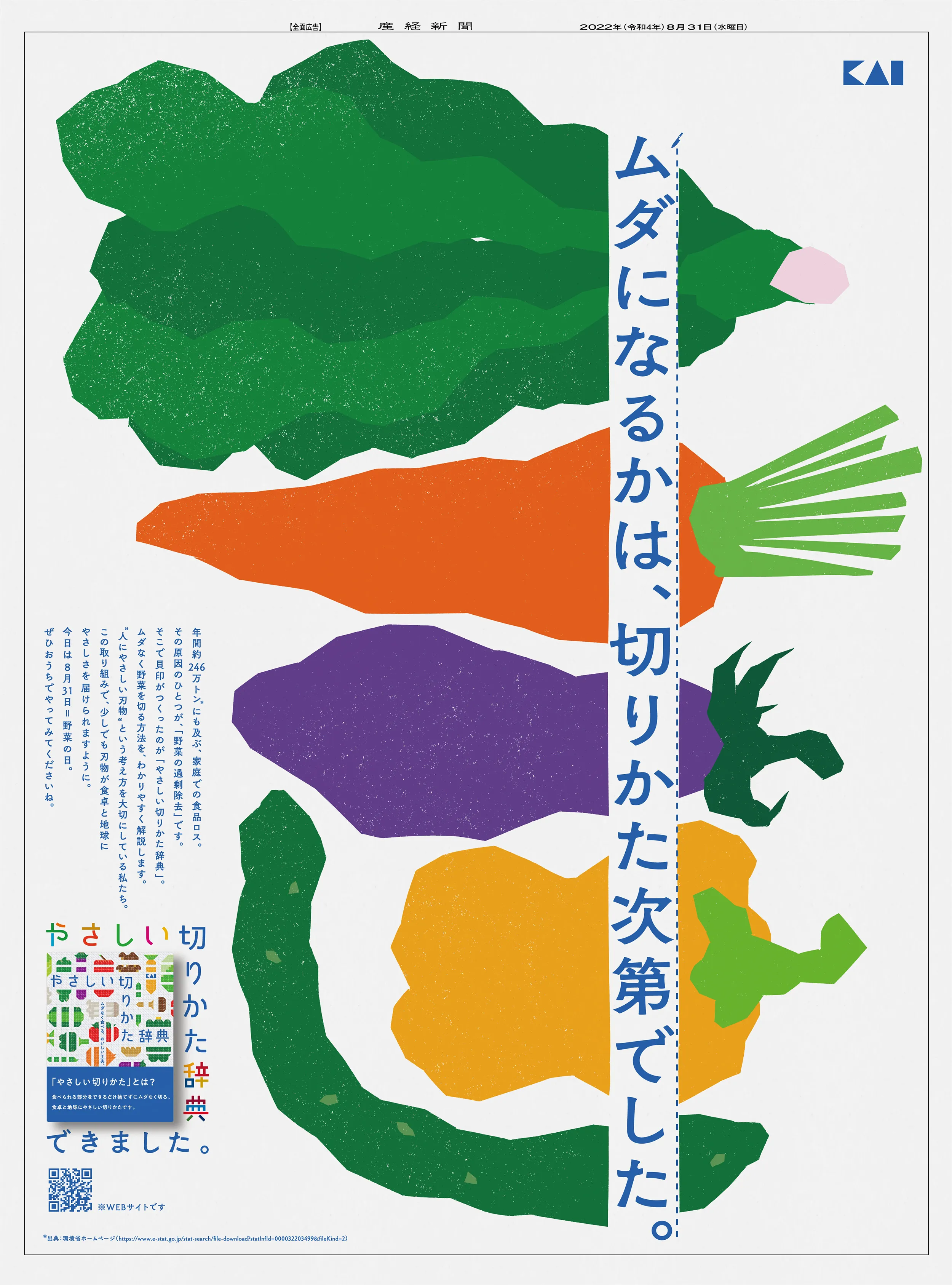 グローバル刃物メーカーの貝印株式会社(本社:東京都千代田区、代表取締役社長兼COO:遠藤 浩彰)は、食品ロス問題の取り組みの一環として、2022年8月31日(水)「野菜の日」より、Webサイト「やさしい切りかた辞典TM」を開設します。食品ロスの中でも食材を“ムダに切りすぎてしまう”過剰除去に着目し、地球にも食卓にもやさしい、野菜をムダなく調理する方法やオリジナルレシピなどについて紹介します。