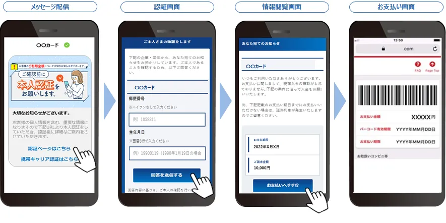 認証サイトでは、ログインIDやパスワードなど確認・再発行などの手間が生じる情報ではなく、氏名や生年月日などその場で入力可能な本人情報で認証可能であるため、生活者が途中で離脱することなくスムーズに情報を閲覧することができます。また、認証後に遷移するWebサイトは自由に指定できるため、料金収納サービスなど他のサービスへ遷移することも可能です。