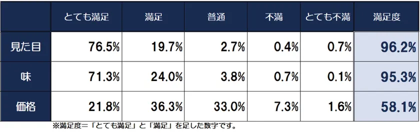 商品を購入されたに「見た目」「味」「価格」について5段階評価で入力していただいたところ、「見た目」と「味」については、「とても満足」「満足」と回答いただいた方がそれぞれ96.2%、95.3%と極めて満足度の高い結果となりました。一方、「価格」の満足度は58.1%にとどまりましたが「普通」(33%)と合わせると90%近い方が「高くない」と感じていただけていることが分かりました。