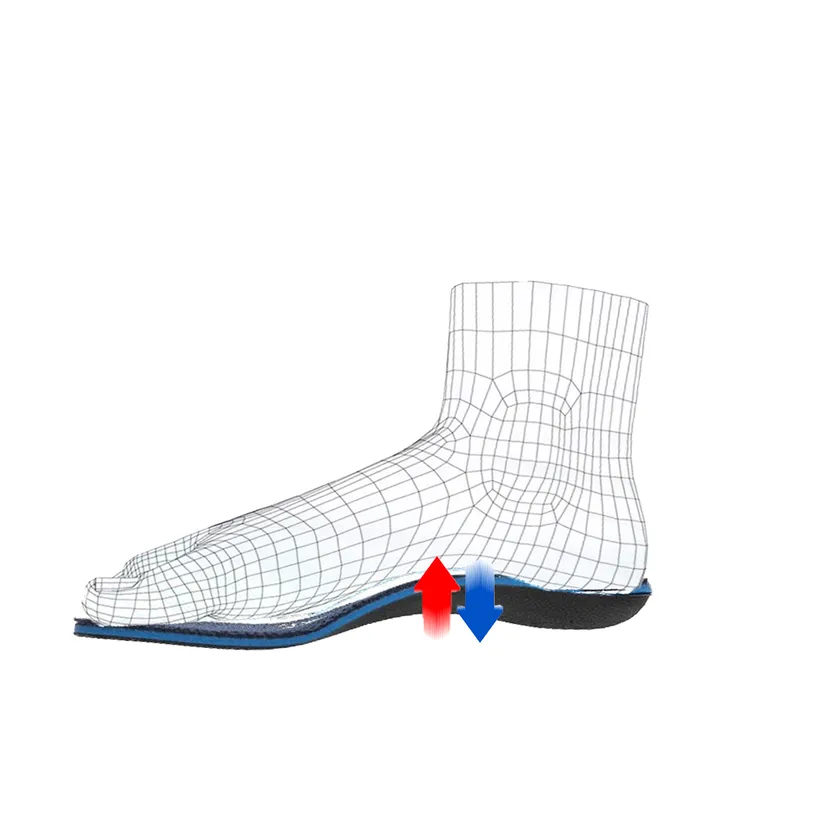 さらには衝撃吸収をサポートするブルーのマイクロポリマーシートを全面に採用することで、ランニング、ウォーキング、トレッキング、登山、フィットネスなど足全体からくる衝撃を和らげ、足腰からくる疲労感、フットケア、などの改善にも効果が期待されます。