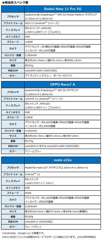 ビッグローブ株式会社(本社:東京都品川区、代表取締役社長:有泉 健、以下 BIGLOBE)は、モバイルサービス「BIGLOBEモバイル」において、迫力の映像を楽しむことができる大画面スマートフォン「Redmi Note 11 Pro 5G」、「OPPO Reno7 A」、「moto e32s」の提供を9月1日より開始します(注1)。