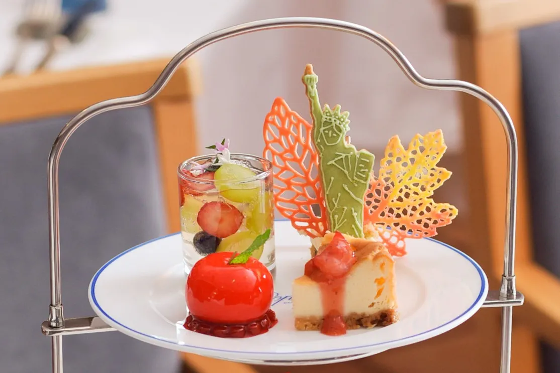 今回登場するのは、秋の味覚も取り込んだ特別なアフタヌーンティー。ニューヨークの別名「ビッグアップル」をモチーフにしたリンゴのムースや、濃厚な本場スタイルの特製ニューヨークチーズケーキ、みずみずしいシャインマスカットを合わせたジュレなどのスイーツが並びます。また、美味しくてヘルシーなアメリカンセイボリーもご用意しております。ブーケのような華やかなサラダに加え、特製のパテとソースにこだわったハンバーガーなど、バラエティ豊かなラインナップです。
