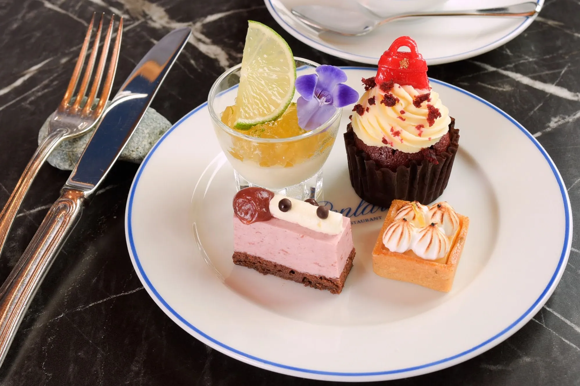 セントラルパークの紅葉をイメージした葉形のチュイルと、有機人参のキャロットケーキ。マンハッタンの人気店からインスピレーションを受けた、ニューヨークチーズケーキ。リンゴの美味しさを詰め込んで、艶やかに仕上げたビッグアップル、タイムズスクエアの煌めきをモチーフにしたフルーツのジュレなどが華やかに並びます。