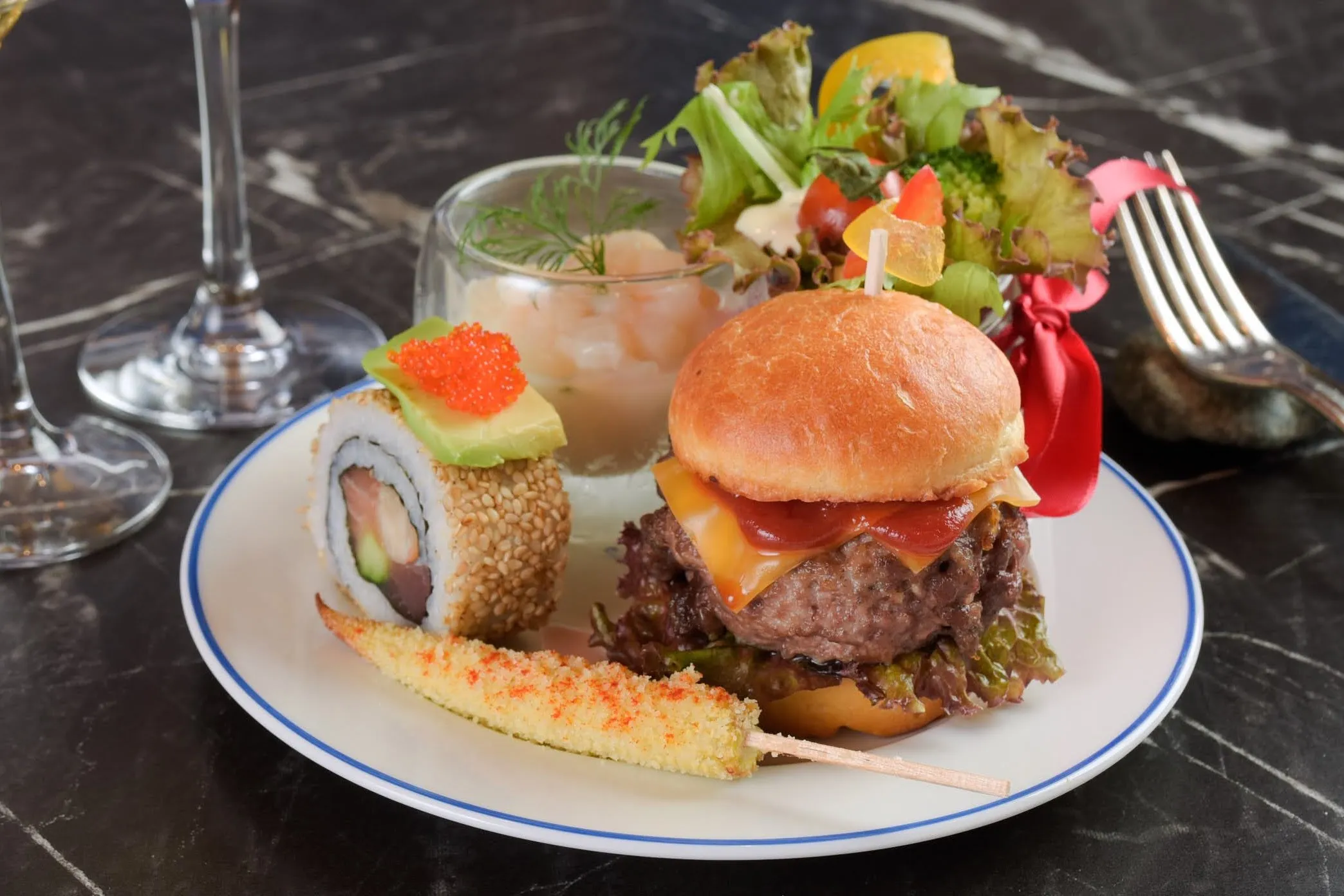 ボリュームのある特製パテとソースが自慢のハンバーガー。花束に見立てたブーケサラダ、クラムチャウダープリン。ニューヨークスタイルの巻き寿司、SUSHI ロール。グリルしたヤングコーンをスパイスとチーズで仕上げたスパニッシュコーンなど盛りだくさん。