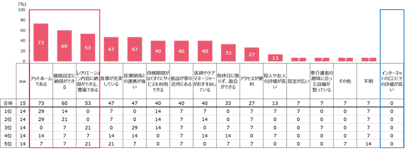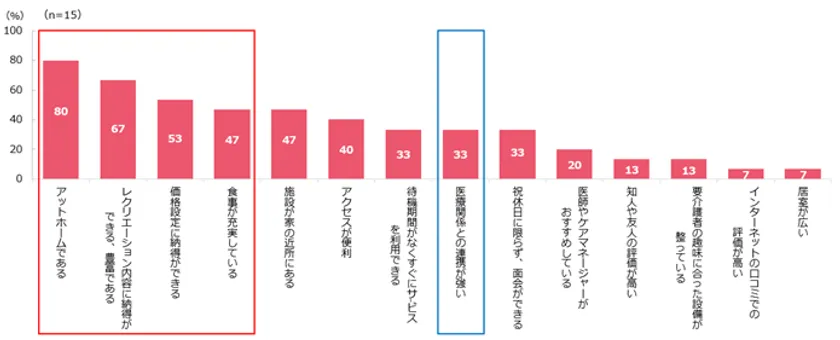 また、現状の介護サービスの評価理由の上位4項目である、「アットホームである」「レクリエーション内容に納得ができる、豊富である」「価格設定に納得ができる」「食事が充実している」は、介護施設を選択する際に重視している項目のトップ5に入っています。一方介護施設を選択する際に重視度が高かった「医療関係との連携の強さ」については今後強化していく余地があります。