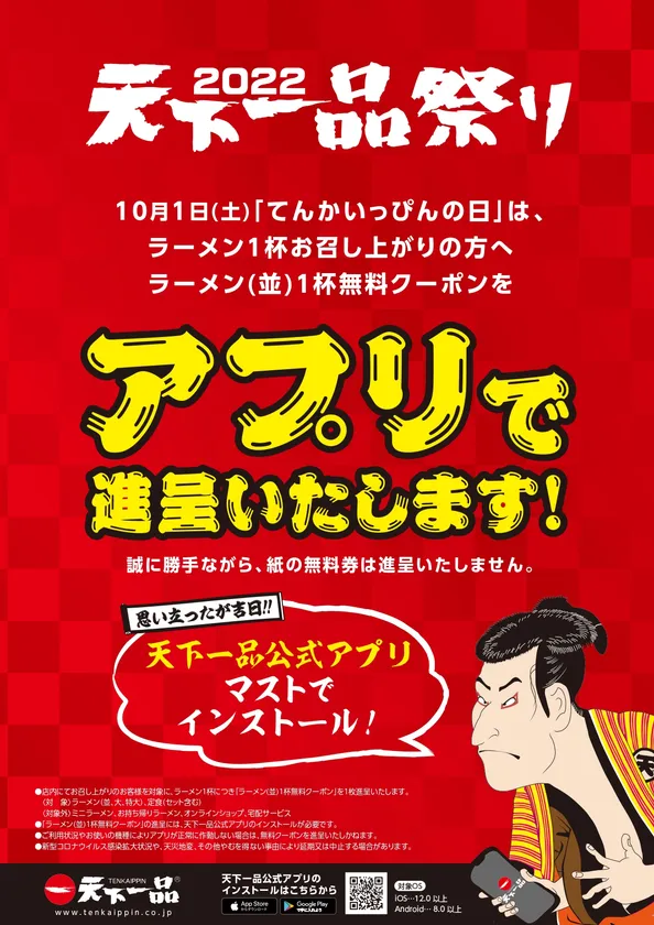 3年ぶりに10月1日「てんかいっぴんの日」に無料クーポンを進呈! 今年もアプリにて『天下一品祭り』開催します!!