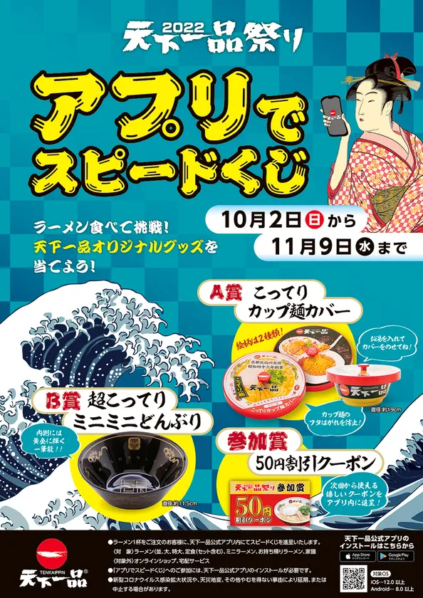 店内にてラーメン(お持ち帰りラーメン含む)をご注文のお客様を対象に、天下一品公式アプリにてスピードくじに挑戦できます。スピードくじ参加者全員に参加賞として50円割引クーポンをプレゼント。さらに当選すれば、天下一品オリジナルグッズをプレゼントいたします。