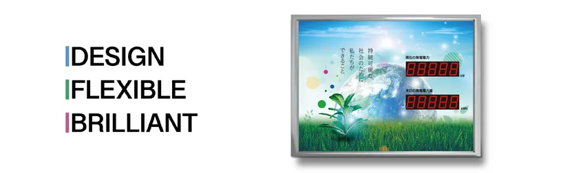 環境貢献PRに最適なオリジナルデザインをご用意。社名やタイトルを自由に変更でき、表示項目や桁数は選択いただけます。また、スリムな筐体で、オリジナルキャラクターやイラストレーションを使用したカスタマイズにも対応。カスタマイズデザインでは盤のサイズやLEDのサイズ・表示位置の変更が可能です。洗練されたデザインで効果的な環境貢献PRを実現します。