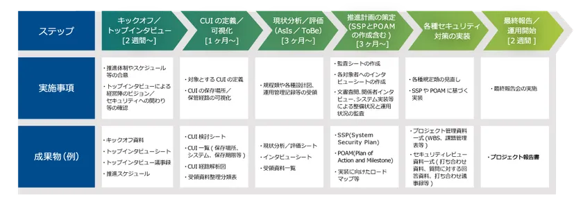 トップインタビューで投資や育成等のセキュリティ戦略をお聞きし、その後、CUIの定義/可視化、現状分析/評価、推進計画の作成、具体的なセキュリティ対策の実装と進みます。CUIの定義/可視化や、現状分析/評価などでフェーズを区切って支援することも可能です。