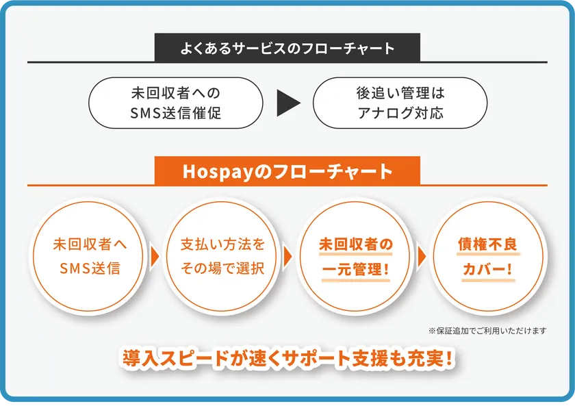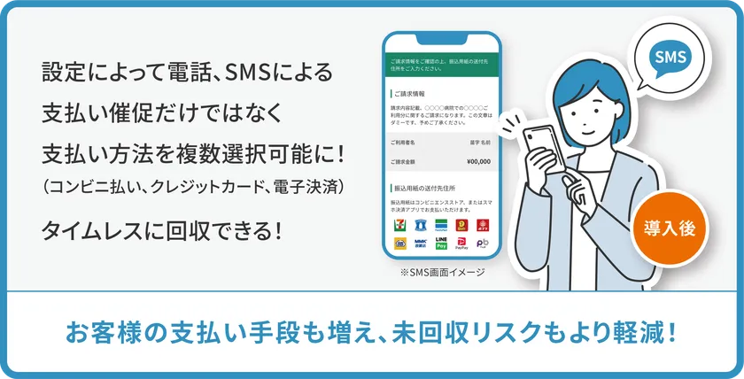 今回、Hospayをご利用いただくことで、SMSと多彩な決済手段を掛け合わせることが可能になり、未収金の回収率の向上、架電による督促の業務軽減が見込めます。さらに法律事務所への自動連携の機能も搭載されております。